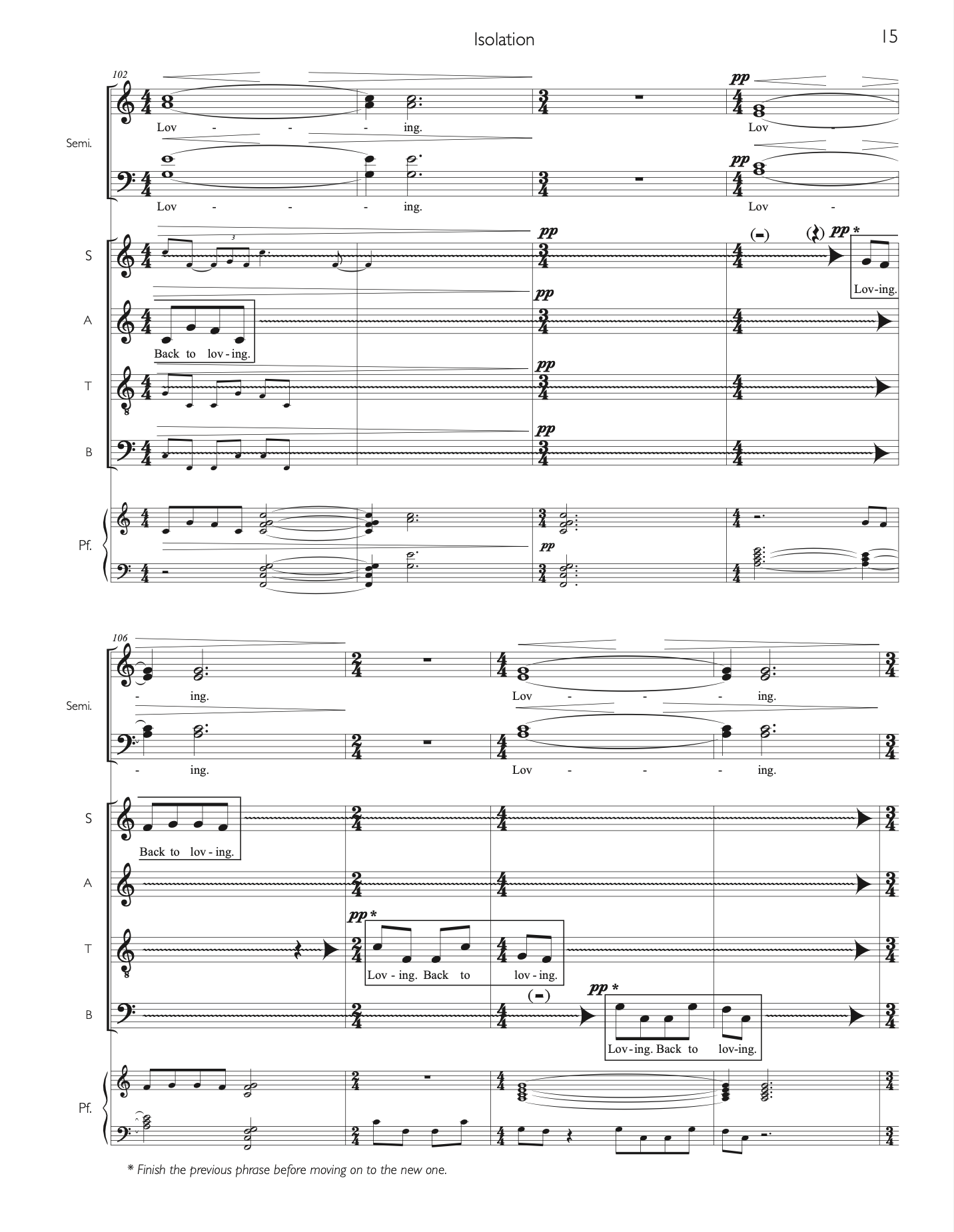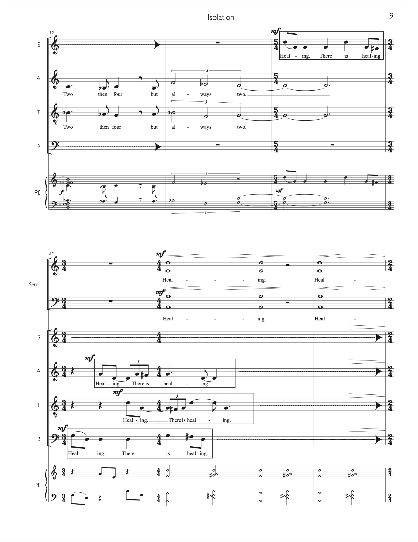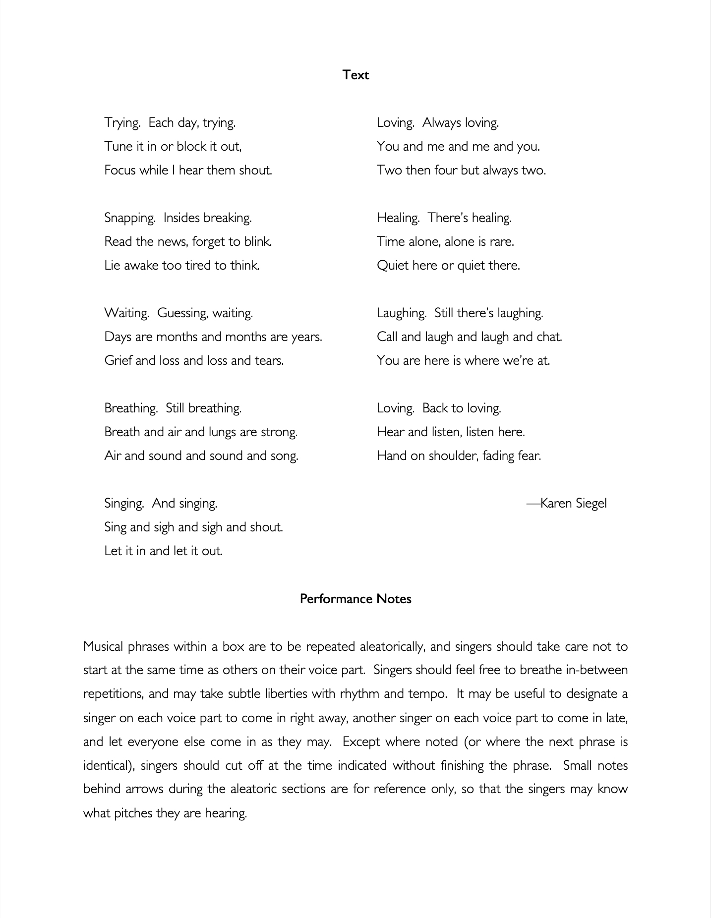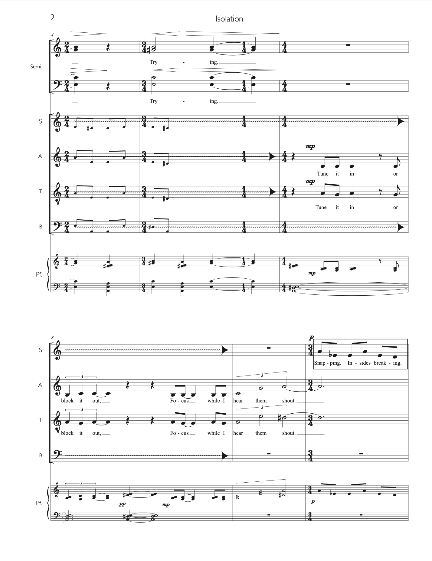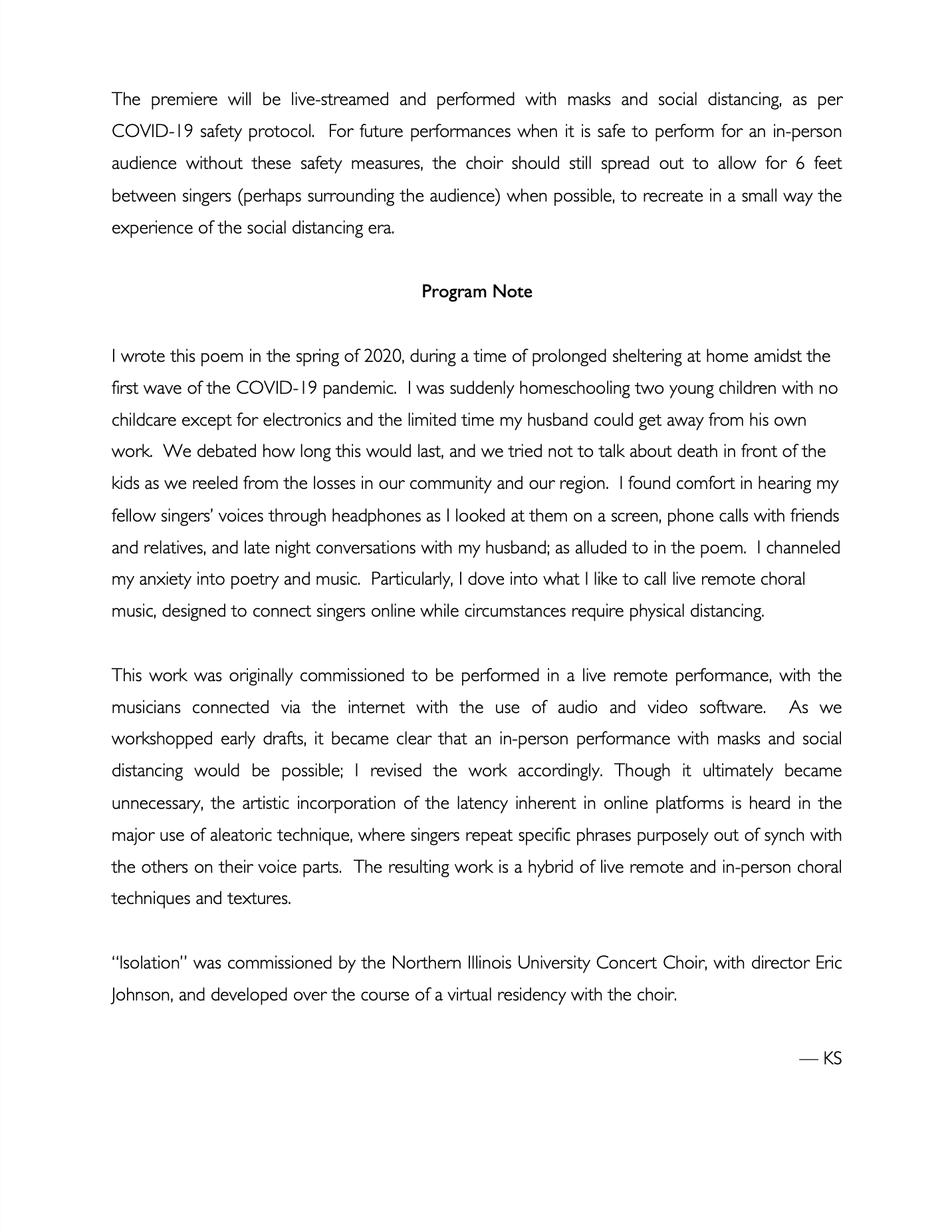 “Isolation” was commissioned by the Northern Illinois University Concert Choir, with director Eric Johnson, and developed over the course of a virtual residency with the choir. I wrote the text of this work in the spring of 2020, during a time of prolonged sheltering at home amidst the first wave of the COVID-19 pandemic. It was originally intended to be performed in a live remote performance, with the musicians connected via the internet with the use of audio and video software. As we workshopped early drafts, it became clear that an in-person performance with masks and social distancing would be possible; I revised the work accordingly. Though it ultimately became unnecessary, the artistic incorporation of the latency inherent in online platforms is heard in the major use of aleatoric technique, where singers repeat specific phrases purposely out of synch with the others on their voice parts. The resulting work is a hybrid of live remote and in-person choral techniques and textures. “Isolation” travels an emotional arc from fear and anger towards peace, joy, and love.