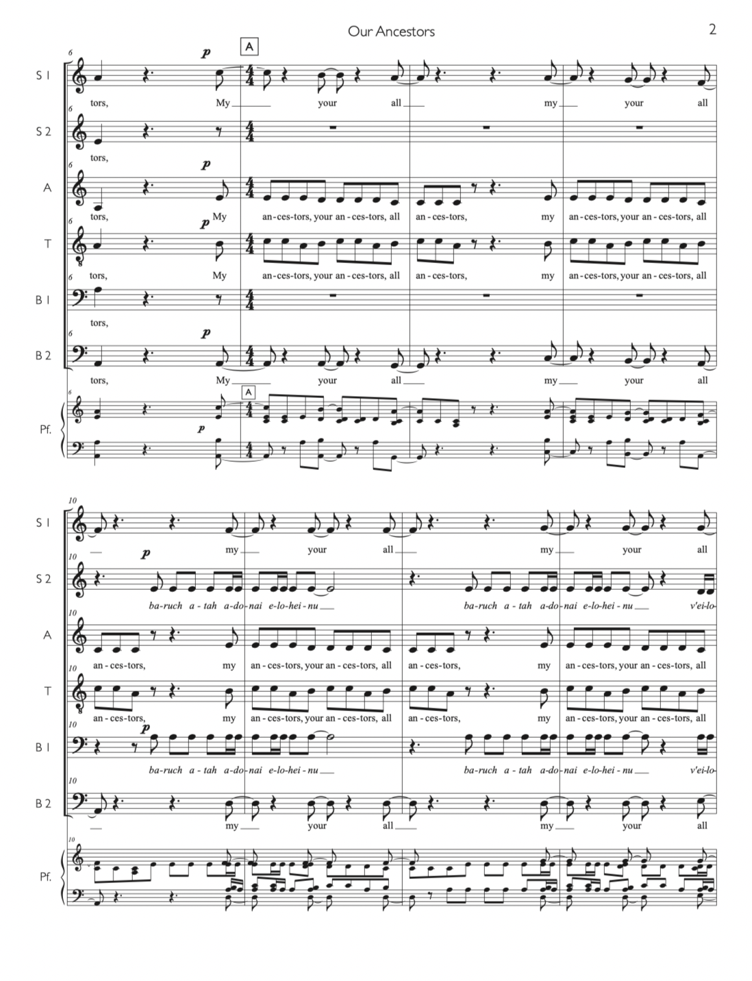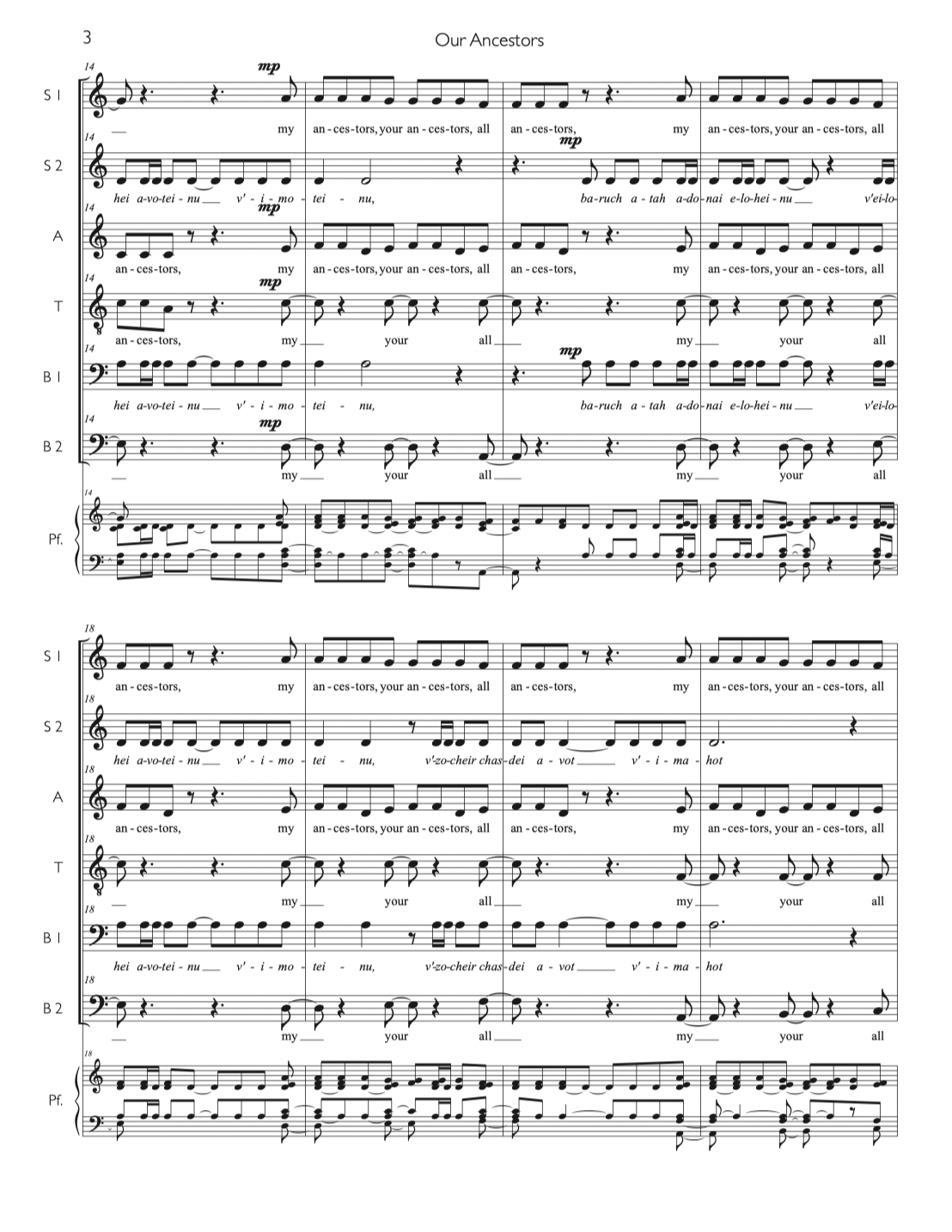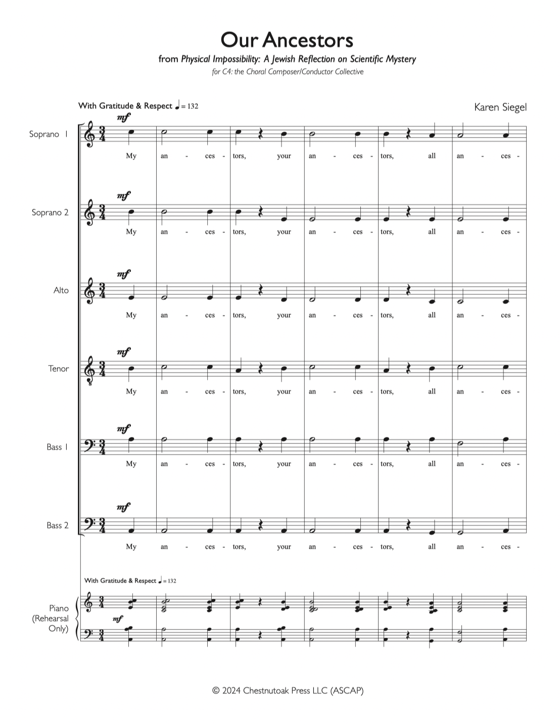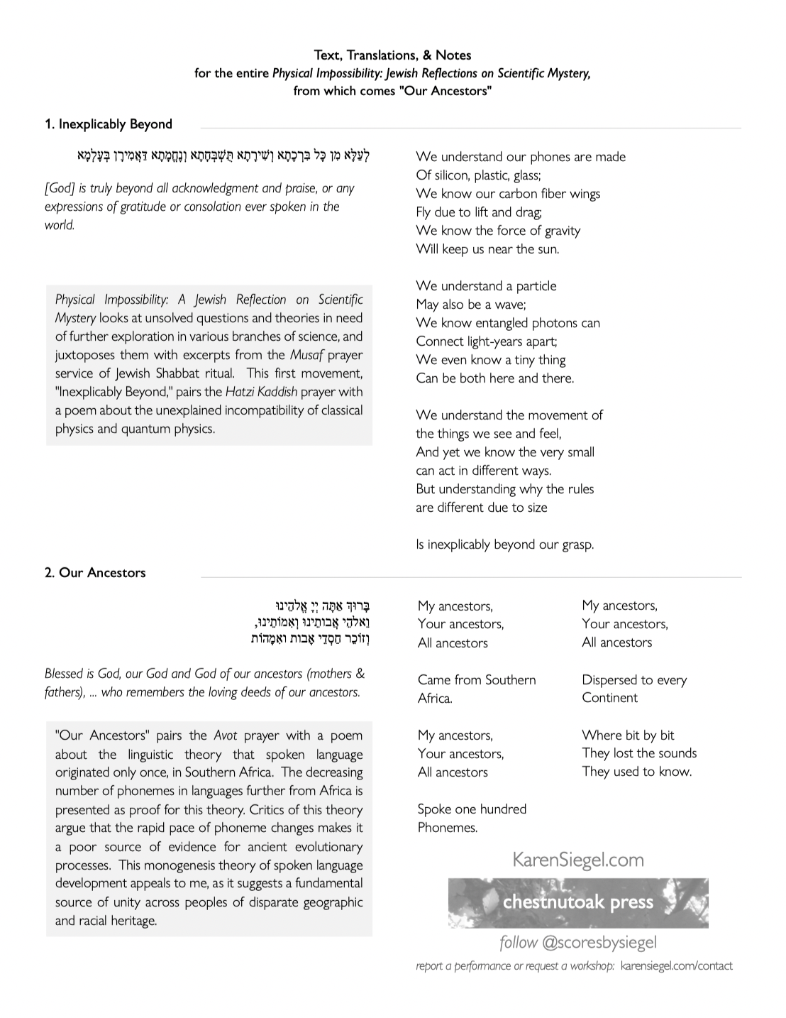 “Our Ancestors,” from Physical Impossibility: A Jewish Reflection on Scientific Mystery, pairs a prayer about remembering and honoring ancestors with an original poem about the linguistic theory that spoken language originated only once, in Southern AfricaThis monogenesis theory of spoken language development appeals to me, as it suggests a fundamental source of unity across peoples of disparate geographic and racial heritage.  Premiered by C4: the Choral Composer/Conductor Collective March 14th & 15th, 2025; with conductor Daniel Andor-Ardó.  Practice tracks are available.